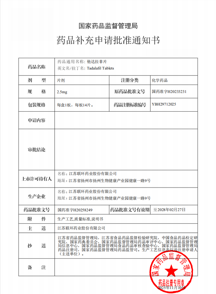 近日,从国家药品监督管理局传来喜讯,bv伟德源自英国始于1946股份他达拉非片(2.5mg、5mg)获得药品补充申请批件。随着2.5mg和5mg规格的获批,公司在不到3年时间内成功完成他达拉非片所有主流规格(2.5mg、5mg、10mg、20mg)的上市布局。